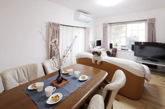 不同以往的選用乳白色皮質(zhì)座椅來搭配房間的原木地板,調(diào)和房間顏色的同時增加了房間的柔和度。配合著客廳淺粉色的窗簾,瞬間讓房間變得高雅無比。