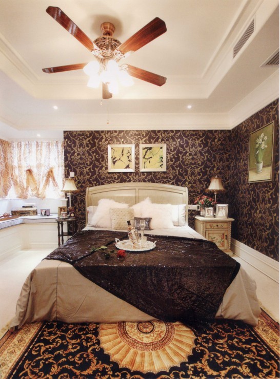 主臥用色極為大膽,以黑色作為背景的金花壁紙與宮延風(fēng)格羊毛塊毯運(yùn)用,令空間突顯了奢華富麗。兒童房的色彩對(duì)比極為強(qiáng)烈,各式卡通玩偶則令兒童房童趣盎然。