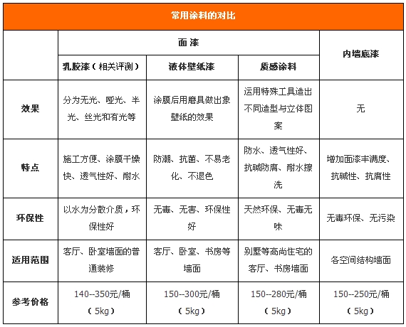 通過對各種常用涂料的效果、特點、環(huán)保性、價格等對比,業(yè)主們可以根據自己的實際情況來挑選適合自己的涂料。