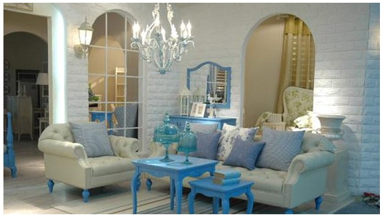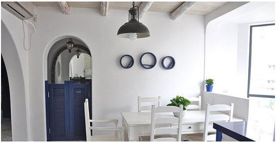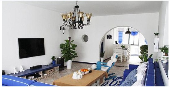 地中海首先映入眼簾的就是那片經(jīng)典的海藍,為了在視覺上第一眼就渲染出濃郁的地中海風情,客廳整體色調(diào)為藍白色,空間多選白色,再飾以明媚的天藍,明朗又干凈,讓人仿佛徜徉在海洋之上。