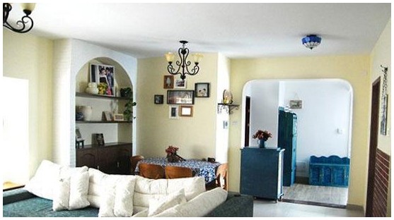 藍白色條紋的沙發(fā)凸顯出了地中海高雅別致的感覺,給一片藍色中注入一些別樣的色彩,細節(jié)點綴很到位。寬大低矮的拱形門給客廳呈現(xiàn)更多的視覺觀感,將餐區(qū)風光透露到這里。