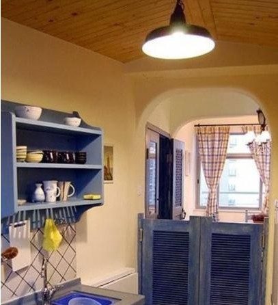 如此美的廚房空間,拱門上裝飾一扇做舊復古的藍色半木門,讓視線眼神出去,空間感變得通透開闊。這樣搭配精美的房間對于生活在鋼筋水泥叢林中的現(xiàn)代人來說絕對是一種享受。