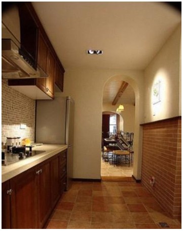 廚房空間很大,整體色調(diào)古樸,仿古磚的鋪貼,墻面磚的裝飾,原木系的整體櫥柜讓室內(nèi)風格得以延續(xù)。小而精巧的拱形門讓廚房空間更添幾分俏皮和浪漫。