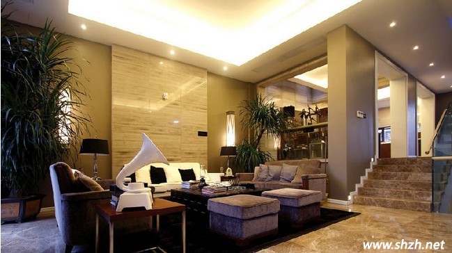 大家再跟著小編想四周墻面和地面上看去,兩者的材質(zhì)采用的都是大理石,再加上燈光的照射讓墻壁和地面顯得非常有光澤??蛷d內(nèi)擺放的體積比較大的綠色植物盆栽,讓整個客廳不僅有著古典歷史文化的氛圍,而且也體現(xiàn)出了客廳的自然樸實的氣息。