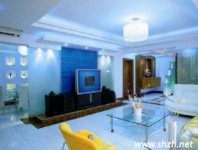 地面:地面和沙發(fā)都選用白色的,很好的緩沖了藍(lán)色所帶來的大面積的沖突感,整個(gè)空間看起來更加的協(xié)調(diào)。