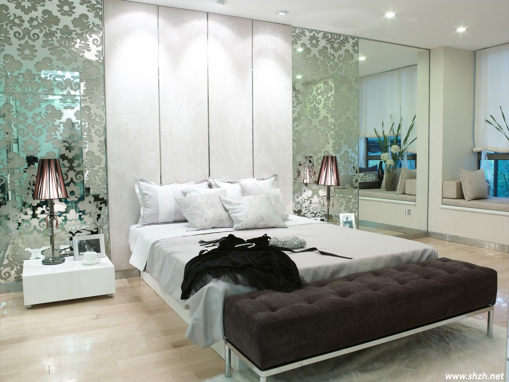 床是臥室的活動中心,所以應(yīng)當(dāng)擺放在房間的中部,并且通向床的道路應(yīng)盡量通暢,使其成為最方便接近的地方。如此放置使人感覺房間被床分成了兩部分,因而看起來更大一些。兩個(gè)床頭柜分置于床的兩邊。衣柜則放置在床的對面,這樣既對稱,又能非常方便地看電視。