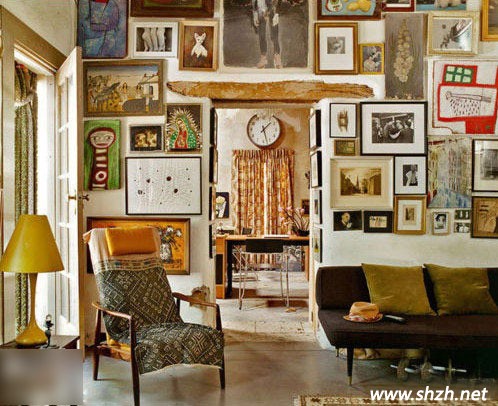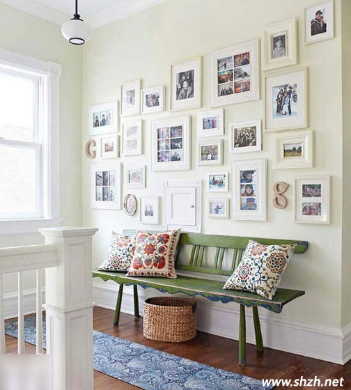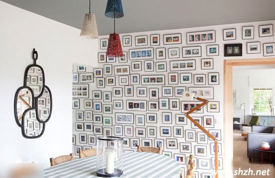 將家中的老照片或者自己喜愛的藝術(shù)化,隨意的貼在墻上,排成任何形狀都取決于你的興趣愛好,也能成為很好的裝飾墻。