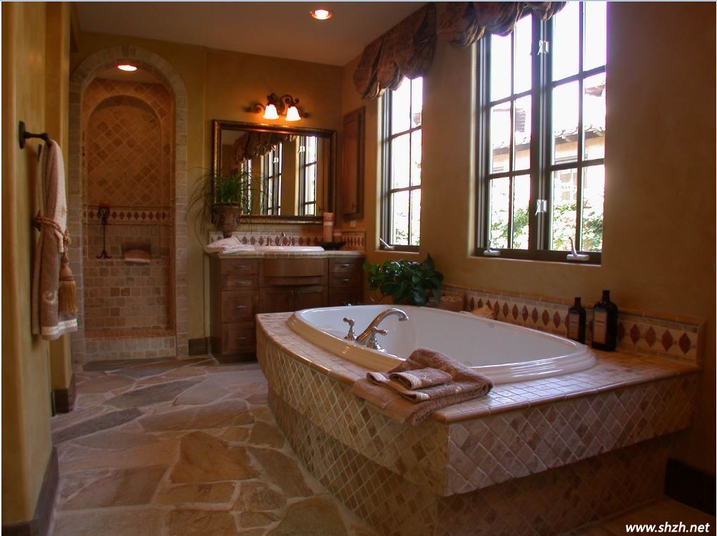 拱形門的裝飾,一下子把西班牙傳統(tǒng)的設(shè)計風(fēng)格帶了進來。大量采用了馬賽克的元素,,馬賽克是西班牙風(fēng)與地中海風(fēng)裝修的寵兒。這個衛(wèi)生間空間并不算很大,但透過玻璃窗自然的光線一樣能夠覆蓋這個空間。