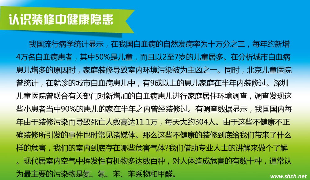 概要: 據(jù)瀟湘晨報長沙訊,一年前,長沙江先生4歲的女兒患上白血病。最近,江先生自己也被確診患有白血病。父女倆先后住進(jìn)省人民醫(yī)院,醫(yī)生的一句“最近家里有沒有裝修”的提問,讓江先生對自家的空氣質(zhì)量產(chǎn)生了懷疑。 家里沒有白血病遺傳史,為什么父女倆會先后患上白血病?江先生百思不得其解。醫(yī)生在詢問病史時,一句“最近家里有沒有裝修”的提問引起了江先生的注意,不過,“我們的房子裝修8年多了,難道還有問題?”