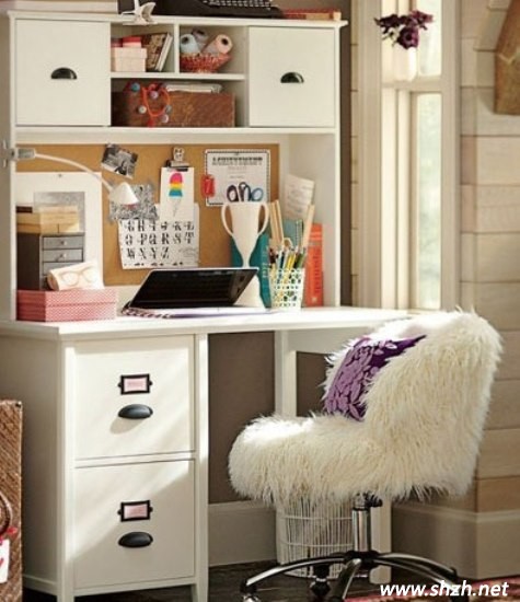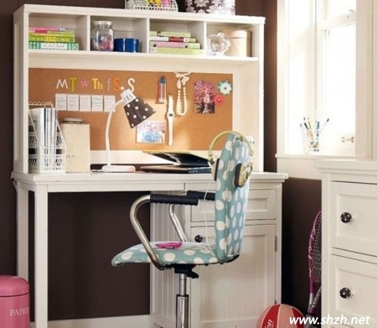白色給人的感覺就是很單純可愛。這款設(shè)計,不管是造型還是色彩上,都配合得十分協(xié)調(diào)。白色提亮了整個空間的亮度,造型優(yōu)雅的書桌使整個空間都透露著優(yōu)美的感覺。收納格子中間懸掛著女孩子喜愛的裝飾品,非常的清新優(yōu)雅。從容淡雅的生活氣息,給孩子帶來了一份清新自然的情趣。