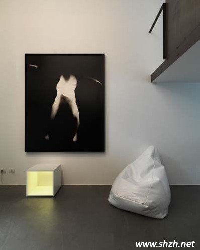 順著一樓的白色樓梯,簡短的上行后,我們來帶了這個LOFT的二樓。二樓因為要讓出兩個樓梯的空間,所以剩下的空間被隔成一個“L”型,第一個樓梯的盡頭處就是這個小客廳了,沒有繁雜的裝修,簡單的沙發(fā)、電視與榻榻米飄窗構(gòu)成了一個時尚個性的會客空間。走過客廳,轉(zhuǎn)身來到一個簡易的工作區(qū)域,為了與一樓呼應(yīng),設(shè)計師干脆把工作臺也設(shè)計成吧臺的造型,讓你隨時享受吧臺樂趣。銜接客廳與工作區(qū)的過道處,一幅抽象畫點亮了單調(diào)的白色墻壁。