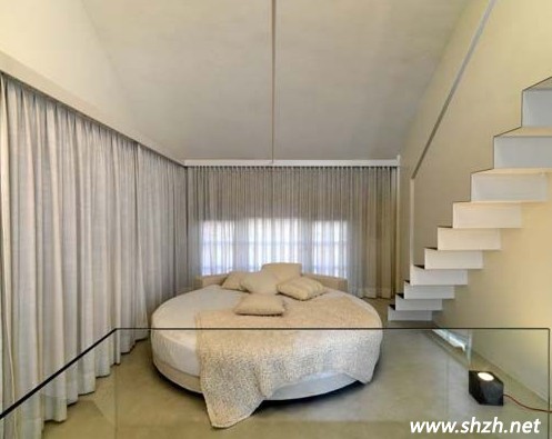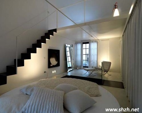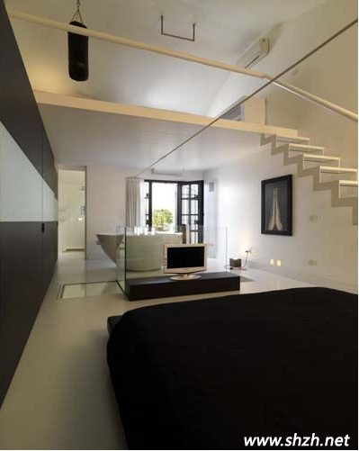 三樓臥室圓床邊的樓梯通向四樓,圖四中的第一幅圖可以看見四樓的全景,左側(cè)是一個巨大的浴缸,讓你享受沐浴的快樂,右側(cè)也是一個臥室的設(shè)計,整棟LOFT的風(fēng)格都是極致簡約。四樓中還有一個樓梯,小編這里就不為大家展現(xiàn)五樓的風(fēng)景了,由大家去想象吧!