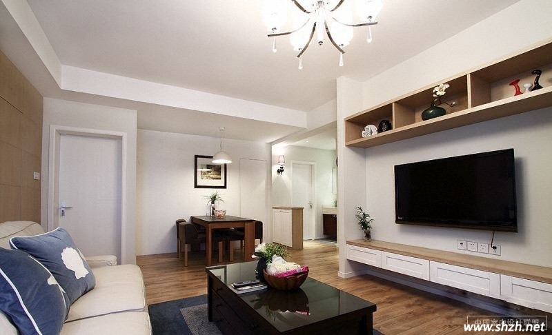 本套著重要說的就是地中海與日式混搭的客廳裝修,白色與木色的加入讓人們?nèi)缤蒙碓谏盍?,絕對讓家變成“避暑山莊”。先來看看客廳的全貌,白色的沙發(fā)上藍色的布藝成了畫龍點睛的一筆,白色與木色結(jié)合的電視柜在此點明地中?;齑钊帐降闹黝},大家注意地面的原木色地板,這才是真正的精華。