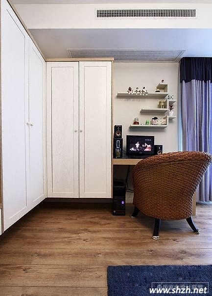 從這幅圖中我們發(fā)現(xiàn)了客廳中的另一個玄機,掩藏在衣柜盡頭的工作空間解決了小戶型中沒有書房的困擾,藤編的椅子清涼無限,白色的衣柜與白色的情面及沙發(fā)想照應,美妙的空間中,木色的茶幾也一個亮點,帶有三層抽屜的茶幾,典雅大氣。
