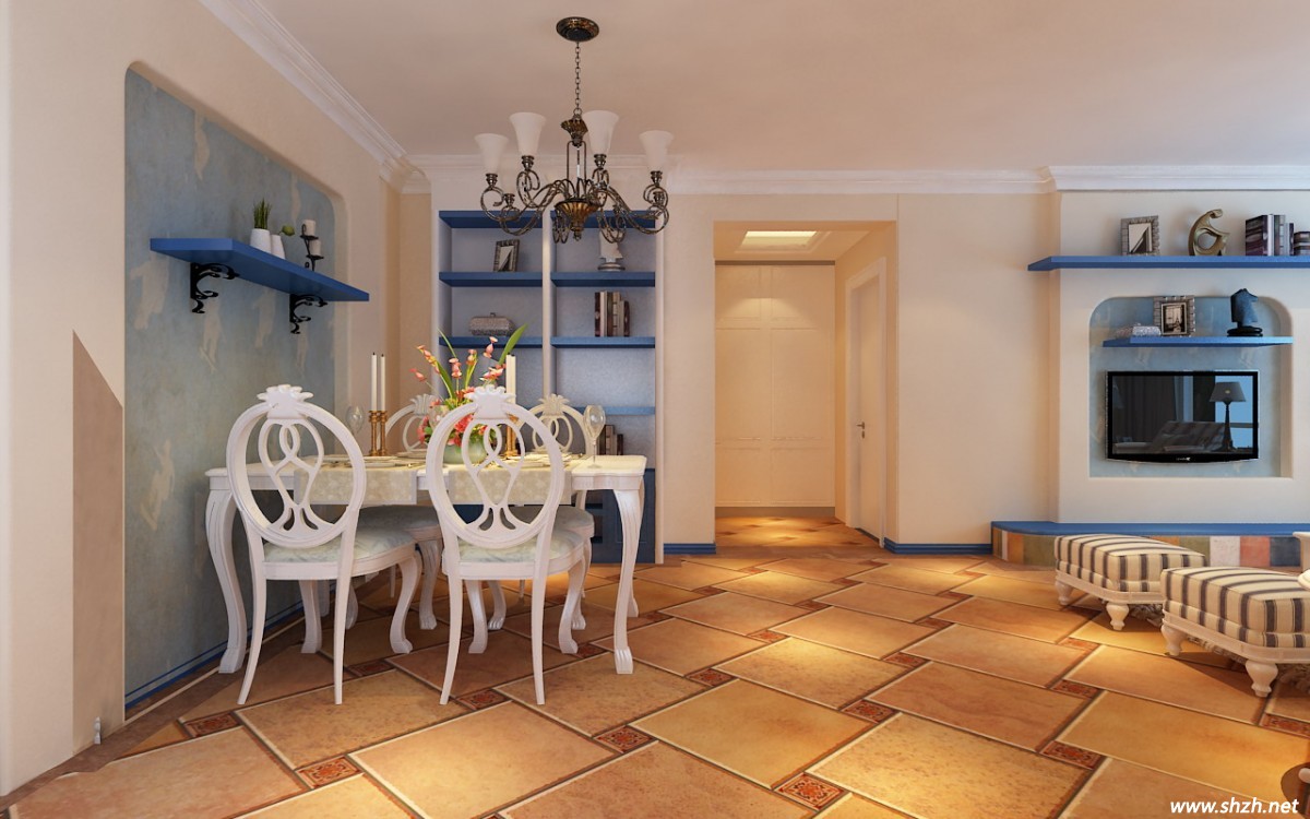 圖一:小戶型的餐廳一般都是設(shè)立在墻角處,這樣的布局讓餐廳與客廳不至于有沖突,而且功能區(qū)分的非常明顯,例如圖一里的這個(gè)地中海風(fēng)的餐廳,設(shè)計(jì)師用一套白色可愛的餐桌椅放在房間的角落里,沒有給空間帶來任何突兀感,同時(shí)設(shè)計(jì)師順便再這個(gè)區(qū)間里增添了兩個(gè)收納空間,酒柜很實(shí)用,餐桌上方的收納板上可以放一些裝飾品,美化空間。