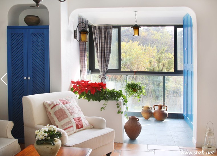 角落里的風(fēng)采。嵌入式的深藍色柜子,帶著濃濃的海洋風(fēng)味,而地面上的各種藝術(shù)裝飾瓶,個性張揚可愛,各種鮮花綠植,更是增添了幾分自然清新的氣息。白色的單人沙發(fā),清新雅致。藍色調(diào)的柜門,更是唯美浪漫。藍白色調(diào)的完美結(jié)合,造就了浪漫的地中海風(fēng)范。