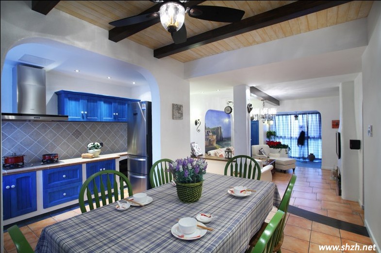當(dāng)真正的進入餐廳,真是讓我眼前一亮。透過拱形門就是廚房的區(qū)域了,藍色調(diào)的櫥柜門是那樣的夢幻。而餐桌上的紫色薰衣草,當(dāng)法式風(fēng)味飄進地中海居室內(nèi),是不是更加的浪漫唯美呢?