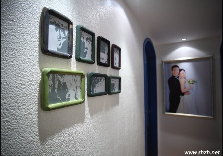 從這里進去就是婚房了,凹凸不平的白色墻壁,紋理清晰可見,古典的相框裝飾墻壁,純白的墻面不再變得單調(diào)乏味。而婚紗照的擺放,讓我們感受到了愛情的美麗。