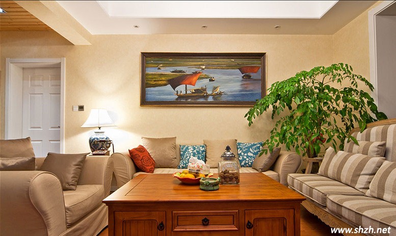 美式鄉(xiāng)村風(fēng)格少不了天然的布藝裝飾,近看沙發(fā)的布局,天然的棉麻、碎花圖案的抱枕、清新自然的植物,無時無刻不在向我們展現(xiàn)鄉(xiāng)村自然的魅力。