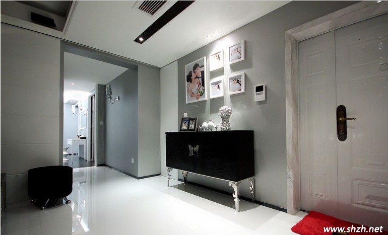 白色是古典的一種色彩,在居室裝修中,使用白色為主色調(diào),能夠使整個室內(nèi)看起來更加寬敞明亮,大方得體。而黑色則給人帶來神秘的恐懼感,也許很多人在裝修中都不敢使用黑色進行裝飾,其實,黑色與其它的色彩合理搭配,也能產(chǎn)生別樣的風采。從古至今一直流傳這樣一個詞“黑白配”,黑白永遠是最配的色彩。看這款設計,以白色為主,黑色家具作為裝飾,用現(xiàn)代的手法和材質(zhì)還原古典氣質(zhì)。黑色精致的皮質(zhì)沙發(fā),豪華而大氣,融合了各種豐富的元素,傳統(tǒng)中帶著現(xiàn)代奢華的氣質(zhì),而材質(zhì)細膩、做工精細的抱枕,彰顯奢華高貴的氣質(zhì),體現(xiàn)出主人對生活的高要求以及對生活的熱愛。墻上的婚紗照,明顯的后現(xiàn)代風格,溫馨浪漫的情調(diào)深深吸引著我們。而紅色的地毯寓意著熱情似火的愛情觀念,且為這淡雅的居室情調(diào)增添了幾分活躍的氛圍。