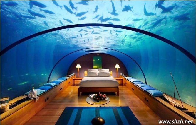 現(xiàn)代有些地區(qū)的游樂場(chǎng)都會(huì)有海底世界,很多人會(huì)去那里體驗(yàn)海底的生活,看著各種各樣的魚在水里盡情的游蕩,三五成群的非常可愛。也許,你也會(huì)想擁有這樣的一個(gè)臥室設(shè)計(jì),這樣可以盡情的觀賞海洋的生物,夢(mèng)幻般的生活非常美妙。而今天,這樣的夢(mèng)想終于可以實(shí)現(xiàn)。看這款全玻璃裝飾的海底臥室,設(shè)計(jì)師巧妙的設(shè)計(jì)不得不讓人驚嘆,充分利用了自然環(huán)境的優(yōu)勢(shì),把自然景觀融入到臥室的設(shè)計(jì)中,仿佛徜徉在海底世界一樣,很奇妙吧!