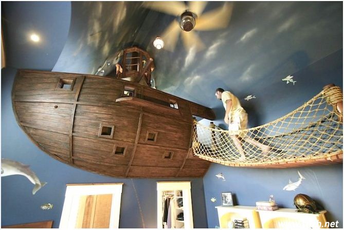 海盜船造型設(shè)計,很難想象吧!有時候,我們只會想到豪華汽車有汽車模型、奢華飛機(jī)有飛機(jī)模型,但我們卻沒有想到將這些模型運用到臥室內(nèi)。而這款設(shè)計,設(shè)計師充分發(fā)揮了想象力,將電影情節(jié)中的海盜船造型運用到了居室內(nèi),天馬行空的想象讓我們佩服。這個海盜船造型的臥室設(shè)計最大的亮點就是有一個超級熱愛航海的航海員的家,整個家都充滿了海洋的元素,例如家中的壁紙都具有海洋的味道。在這里,還可以是小孩子的游樂場所,需要特別注意的是,登上這艘海盜船一定要注意安全,特別是小孩子。