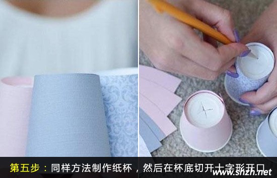 第五步,用同樣的方法為剩下的其他一次性紙杯卷上各式各樣的包裝紙。然后反轉(zhuǎn)杯子,在杯底處畫上橫豎大概2.5cm的十字型,再一個(gè)個(gè)用小刀割開。(注意這里的十字口不能割開太大,否則**燈泡的時(shí)候,杯子則容易脫落哦)