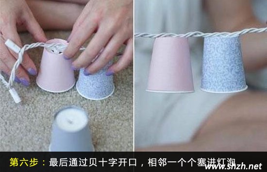 第六步,最后,準(zhǔn)備好足夠的杯子之后,拿出購買的彩燈條,把其中的燈泡一個(gè)個(gè)一個(gè)個(gè)依次地通過割開來的十字刀口塞進(jìn)一次性杯子里面。