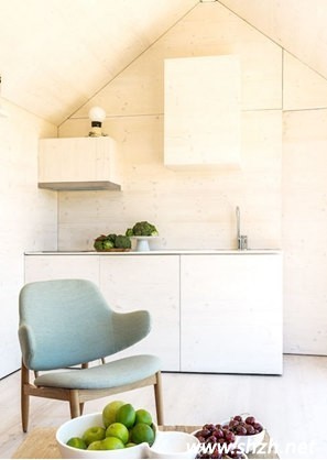 斜面廚房設計,很好的將尖錐形的空間給利用了起來。定制的櫥柜呈現三角形,中間留出的操作區(qū)域也隨著柜子的延伸而變大。進門之地能從墻面中延伸簡易的桌面,從而設計成簡易的吧臺,正好能將三角形櫥柜后方的大面積空間給利用起來。