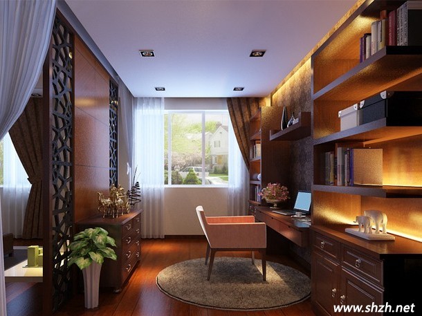 開放式書房在小戶型的空間里同時(shí)也具有很大的裝飾效果,但是干擾較大,因此會(huì)降低工作效率。所以我們就需要注意在用書櫥或用柜子、布幔等將空間隔開的同時(shí),還要保證書房的隔音效果。地面應(yīng)選用木地板或地毯等材料,來降低地面的傳感音效。而墻面的用材最好用壁紙、板材等吸音較好的材料,以取得書房寧?kù)o的效果。如果用布幔來進(jìn)行隔斷,布幔的材質(zhì)最好選用既能遮光又具通透感的淺色紗簾比較合適。