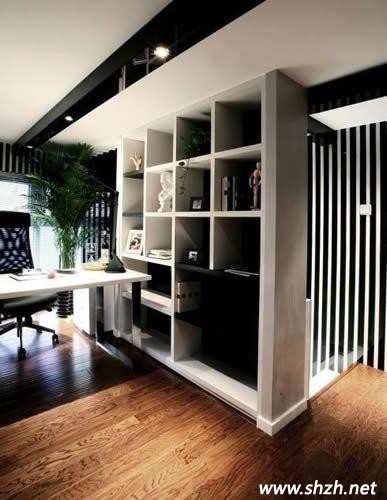 現(xiàn)今大熱的黑白條紋在這個(gè)空間被發(fā)揮的淋漓盡致,瓷磚的選用也非同尋常,創(chuàng)造出的視覺性效果很強(qiáng),整個(gè)空間巧妙的運(yùn)用了黑白灰色調(diào)讓品味得到了充分的提升。不同的空間界面在處理時(shí)可以采用深黑色烤漆玻璃來作為色彩的延伸,墻體可以運(yùn)用一些透明的玻璃,這樣不僅能在視覺上擁有穿透感,又能富有實(shí)質(zhì)性的將空間隔斷。整個(gè)書房在設(shè)計(jì)上很有男性的風(fēng)格,少了女性化的**與嫵媚,更多了幾分男性的陽剛之氣。