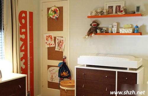 孩子的空間收納性也是很有講究的,不僅要找個(gè)空間將孩子的物品裝在里面,同時(shí)也要將一部分小物品擺放在外面,增添整體的可愛(ài)氣息,這時(shí)候木板就起到了很大的作用,下圖中,橘紅色的兩塊木板上,分層釘在墻壁上,可以分層擺放山高一些小的卡通物品,實(shí)用物品,活潑可愛(ài)的同時(shí),也增加了收納性,一舉兩得,墻上的身高測(cè)量尺讓孩子自己也能隨時(shí)為自己測(cè)量,讓孩子的成長(zhǎng)增添了無(wú)限的樂(lè)趣。