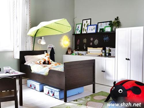 一片大樹(shù)葉支在床的上面讓孩子仿佛置身在森林中,清新自然。若要將房間營(yíng)造出童話般的氣息,就要多用卡通玩具等裝飾品,這樣才能給孩子充分發(fā)揮想象的空間,藝術(shù)的空間同樣也給寶貝藝術(shù)的靈感,讓孩子從小就擁有自己的設(shè)計(jì)夢(mèng)想。