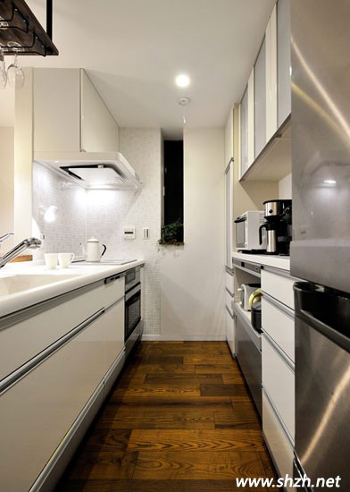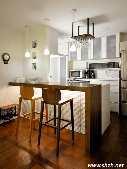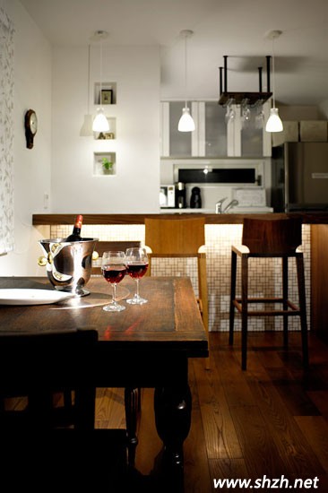 客廳給我們的印象不僅充滿日式的風味,還擁有現(xiàn)代時尚的氣息。而廚房的設(shè)計,木質(zhì)搭成了一個小吧臺,款式簡單,卻依舊清新靚麗。兩張細高的座椅,原木打造,卻別有一番風味,造型獨特美觀,不失時尚性。白色的廚房空間,提升了空間的亮度,視覺上更加寬敞。也許你并沒有在意角落里的那個小小酒架,但這樣的設(shè)計卻盡顯溫馨浪漫,將幾瓶紅酒插入,拿取也很方便,夫妻小兩口在此品酒聊天,浪漫無比。