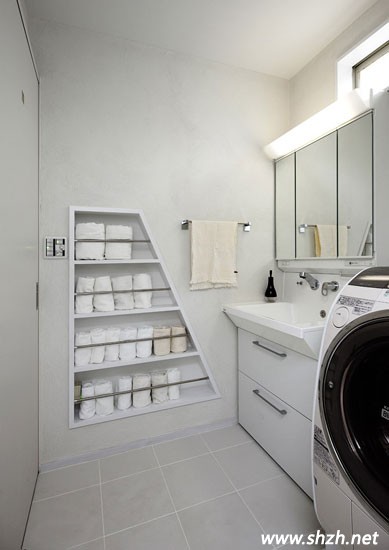 白色的衛(wèi)浴間設(shè)計,寬敞明亮,內(nèi)嵌式的架子,分層擺放毛巾,毛巾的色彩也能將小小的空間裝飾的活潑可愛。白色的水池,下面設(shè)置了兩個大的抽屜,擺放日用品,保證了衛(wèi)生間的干凈整潔。而鏡子則由三塊鏡子拼湊而成,一定程度上擴大了視覺空間,使得整個區(qū)域更具有靈動性與立體感。