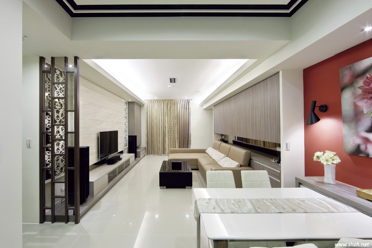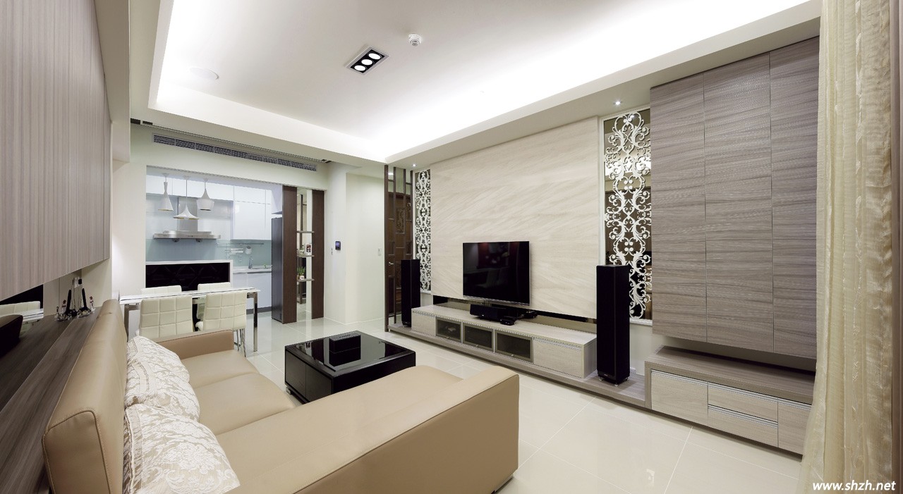 在客廳的設(shè)計中,考慮電視主墻跟玄關(guān)有銜接關(guān)系,于是設(shè)計師藉由大地色柜體與主墻大理石作色彩呼應(yīng),但以質(zhì)地界定出主配角地位。接著在兩側(cè)茶鏡前襯上白色雷射雕刻的窗花來增加造型,如此一來,柔和的色系帶來舒適感受,空間也因方整的柜體確保了簡潔實用的底蘊,而曲線柔美的裝飾則回應(yīng)了女主人保留浪漫的心愿。此外,設(shè)計師還利用沙發(fā)上的大梁作墻面統(tǒng)籌,先以中央斷開的上下排系統(tǒng)柜呼應(yīng)電視主墻幅寬,并透過茶鏡反射強化明亮與景深。
