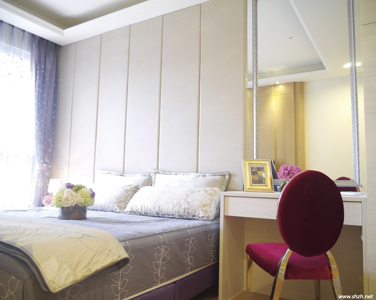 來到臥室中,主臥床頭的淺褐色皮革響應(yīng)公共空間色調(diào),直條的繃板縫隙不僅降低了平面的呆板,瘦長的分割比例也具有拉高墻面的視覺效果。床鋪側(cè)對著更衣室,為使空間有所區(qū)隔,設(shè)計師利用灰玻璃與鏤空的白色窗花結(jié)合,如此一來,臥房的柔軟感倍增,色調(diào)上也與鏡面鑲了銀框的梳妝臺更為融洽。梳妝臺旁利用短墻深度作一個直達天頂?shù)母吖?,高柜上端以門片遮掩,底部3/4則規(guī)劃成側(cè)拉形式,讓女主人能輕松取用和收納保養(yǎng)品。