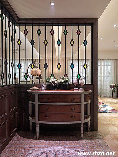 進門就用玄關(guān)將入戶處與客廳隔開,木質(zhì)的玄關(guān)上鑲上上透明的玻璃,讓客廳采光效果更加,復古的木質(zhì)桌椅,擺上歐式臺燈,看的出房屋主人對玄關(guān)處設計的用心,加上玻璃上五顏六色的菱形彩繪玻璃塊,讓室內(nèi)增添一股時尚。