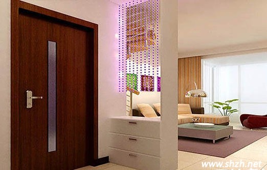 此圖的玄關(guān)裝修并沒有使用大面的玻璃然后加上一些彩繪點飾。而是采用單一的紫色彩繪玻璃連成串當作玄關(guān)。與客廳的簡約裝修風格一致。但是采用紫色室內(nèi)彌漫著永恒的愛的真情浪漫。