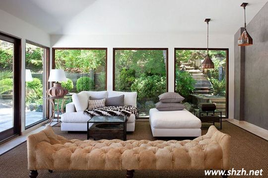 室內的兩邊墻壁完全鑿開全部用作飄窗,簡單的木質鑲邊,沒有華麗窗簾的遮遮隱隱,將外面明媚陽光,山水美色盡覽眼中,身處室內如同置身大自然。室內家具的裝修都是現代簡約風格渲染外面的自然美景,兩個古銅色的吊燈又給別墅增加了一絲復古韻味。