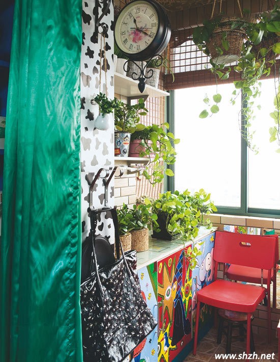 一進門的感覺并不是現(xiàn)在大眾的簡約時尚,炫彩藍色掛布是不是特別引人耳目呢。小小的空間被綠色枝藤充滿著,是不是如進了熱帶雨林一般,墻壁畫又個性十足。純天然的木質(zhì)材料椅子,吊頂上的藤條絕對給你東南亞地地道道的味道。