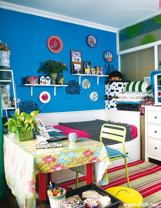 一張簡小幽雅的沙發(fā)床,潔白的沙發(fā)上搭配鮮艷的沙發(fā)墊,加上整個深藍色的背景墻,整體會讓狹小的空間很亮麗略帶一點奢華之感,而且層次也很鮮明。墻上,沙發(fā)周圍,桌子上各式有著各樣色彩艷麗的布藝裝飾和帶有民族特色裝飾物點綴,讓整個空間都活躍起來,別是一番風(fēng)情。