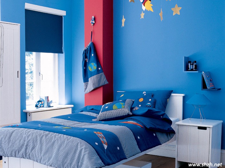 只有純真無邪的孩子才能配得上如此藍色星空夢幻般的房間,在這房間里,孩子會神清氣爽,充滿活力。低調(diào)而養(yǎng)眼的背景色與床單相應(yīng),床單上可愛的卡通圖案將可愛全部烘托出。就連窗簾也全部選用純藍色,讓孩子暢游在寶石藍般的幻想中。