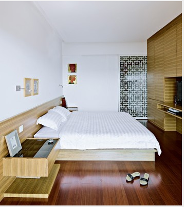 同樣坦蕩的性情,還體現(xiàn)在主臥長廊式的書柜上。擺脫常規(guī)的開放式書柜設(shè)計(jì),也去掉了以書為飾的矯情。用封閉式的木門將長廊式的書柜遮擋得干干凈凈。而里面成堆的書籍,別樣的精彩成為私密享受,而非愉悅他人裝點(diǎn)自己的擺設(shè)。
