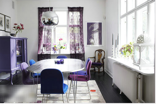 白色和黑色相搭配的餐廳具有時(shí)尚感,最好地表現(xiàn)出充滿品質(zhì)感的就餐空間。至于家具和配飾等,選擇紫色會(huì)令人沉靜平和,而深藍(lán)色的加入也更顯深邃意境。