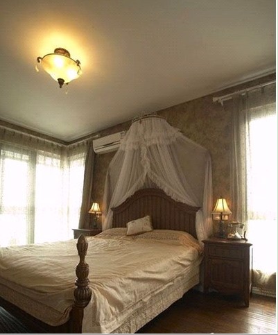 床頭的背景采用大面積的墻紙鋪貼加上軟裝的窗簾都在體現(xiàn)著美式復(fù)古風(fēng)格的奢華!