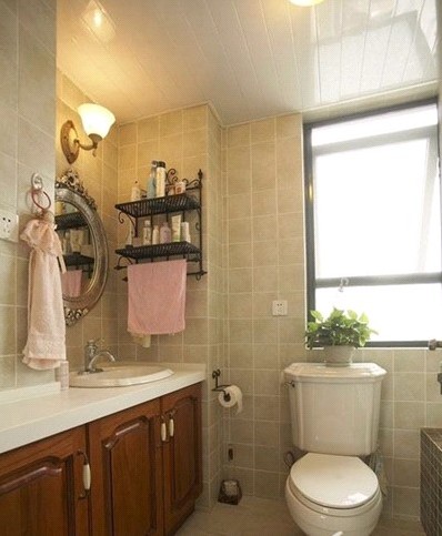 衛(wèi)生間中木質(zhì)的臺(tái)盆柜PVC扣板吊頂150*150的米黃色磚鋪貼是經(jīng)典的美式復(fù)古風(fēng)格的詮釋!
