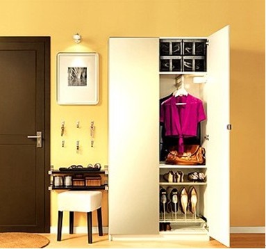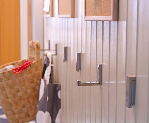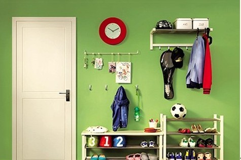 上方則專屬于是父母的儲物區(qū);另外,為了避免空間的浪費(fèi),在柜子中間空出的部分可以安裝一些小掛鉤,用來掛鑰匙或者雨傘等常用小物件。