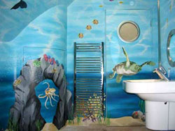 這個專為孩童設計的主題浴室,壁畫復蓋所有的墻壁和天花板。大海---浴室的主題,以美人魚、海龜和海盜遺落財寶為特色,這所有的一切都屬于浴室的擁有者。