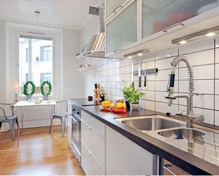 概要: 北歐風(fēng)的裝修我們先從廚房餐廳開始,廚房是白色的櫥柜黑色的臺面,黑與白的搭配堪稱為經(jīng)典。臺面上的蔬菜水果為這個白色圣地畫龍點睛。簡易磨砂玻璃面板的壁柜將廚房凌亂的東西收納于中。廚房另一端是折疊式的餐桌,在窗戶旁邊。采光極好配上兩把灰色的椅子給人一種忙里偷閑的感覺。窗戶邊還有2個綠色的花環(huán)和蠟燭,是為了在這片白色的世界里演繹一段浪漫、溫馨的愛情故事。